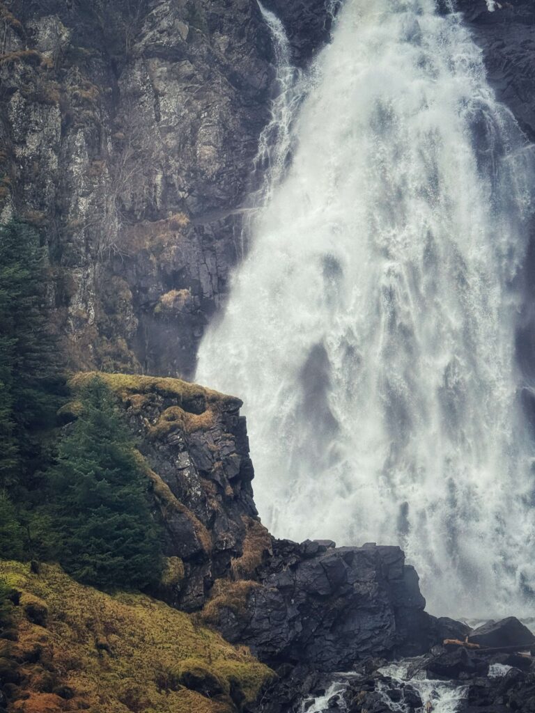 Der Weg wird etwas anspruchsvoller, führt durch Wälder, über Brücken und entlang von Felswänden, immer mit Blick auf die nächsten Wasserfälle: Nyastølfossen, Nykkjesøyfossen und schließlich Søtefossen, der sich in mehreren Kaskaden dramatisch ins Tal ergießt.
